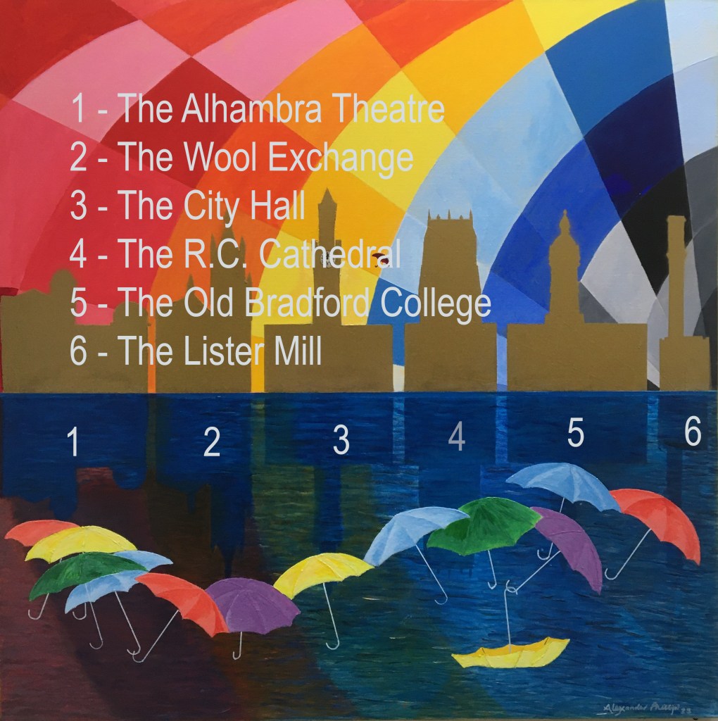 The Iconic Buildings of Bradford reflected in the Mirror Pool in the City Centre